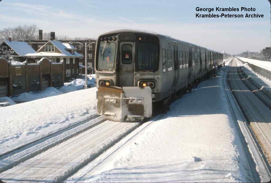 KP0391-CTA #2009 Featuring a large temporary plow Eastbound at Austin - 01/25/1979