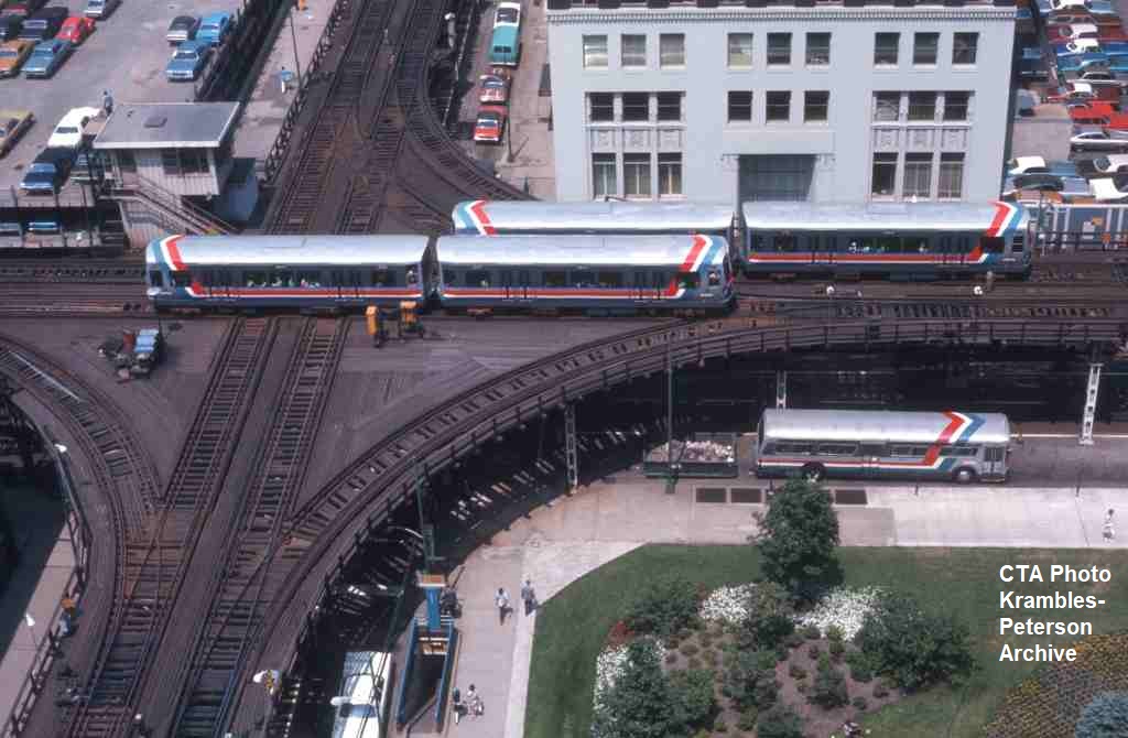 KP0395-CTA #2030, #2176, and Motor Bus #3701 at Tower 18 - 08/01/1975