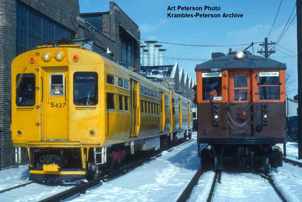 KP0642-CTA #S-427 (x6123) Snowfighter along side Heritage Car #4272 at Skokie - 02/09/1980