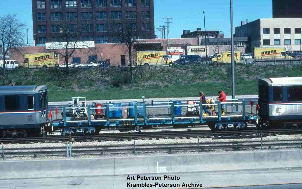 KP0648-CTA #S-453 (x6707 converted to work service 1992) Trailing a Westbound Work Train across the Lake Street Bridge - 06/16/1993 (Thanks to Bruce Moffat for original car number identification)