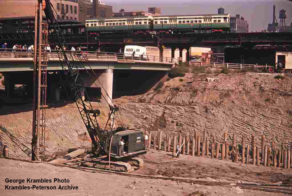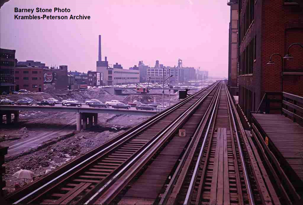 KP0712-CTA Garfield Line, Looking North-Northwest from Halsted. Note columns are gone and installed and expressway construction is progressing - 09/06/1952