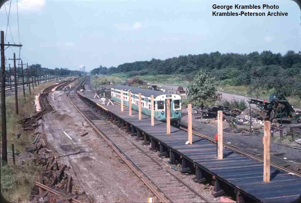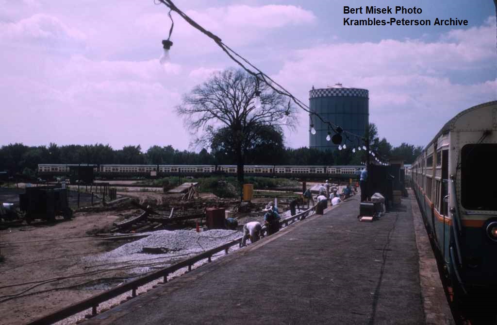 KP0741-CTA Garfield Line, 12-car test train in the platform/loop track during the rearrangement of terminal facilities at Desplaines - c10/1959