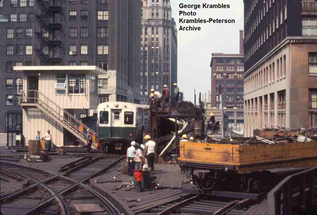 KP0834-CTA Loop, A work crew in the midst of demolishing old Tower 18 as a Ravenswood train comes through the work zone and #S-324 on the work train waits to haul away remnants of the old tower - 09/13/1969