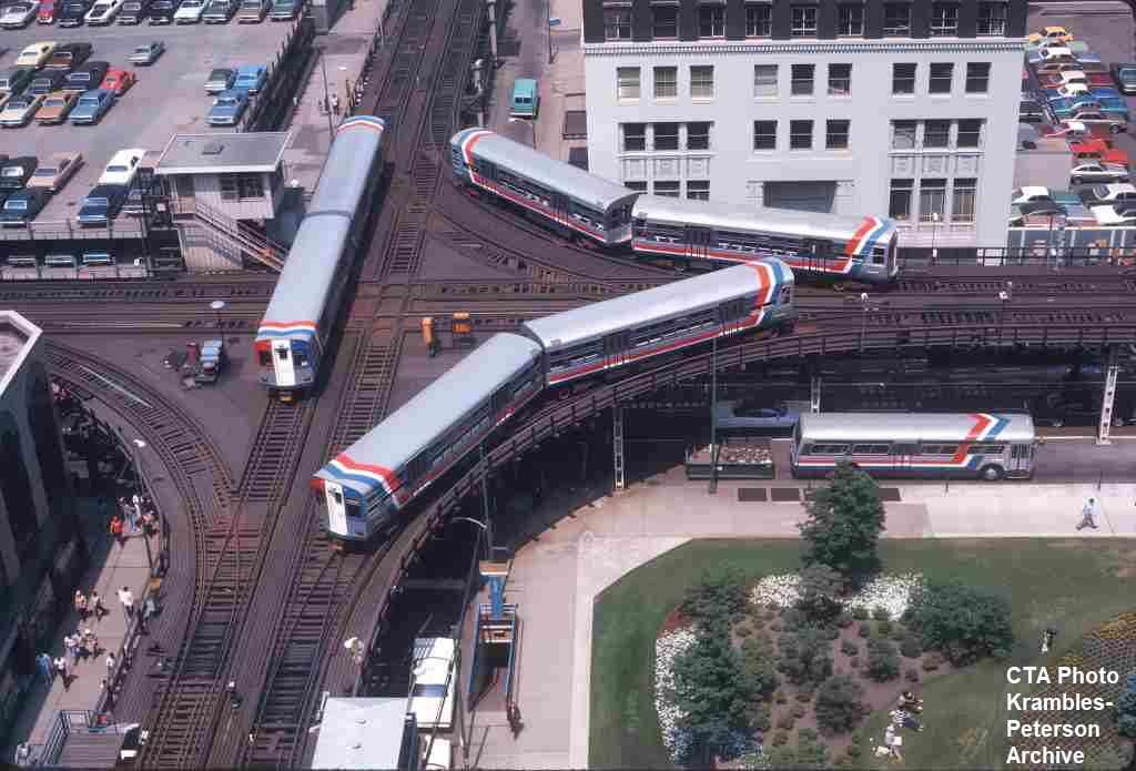 KP0835-CTA Loop, Bicentennial rapid transit cars at Tower 18 along with a bicentennial bus at street level - 08/01/1975