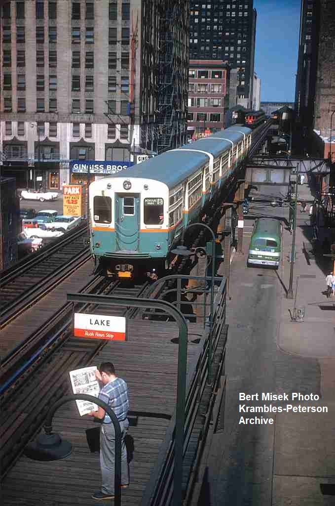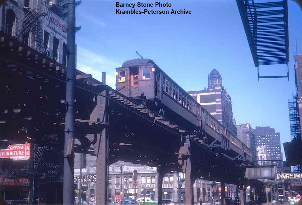 KP0844-CTA Loop, Looking east through Clark & Lake with a Lake Street train of 4000s in the station - c1954