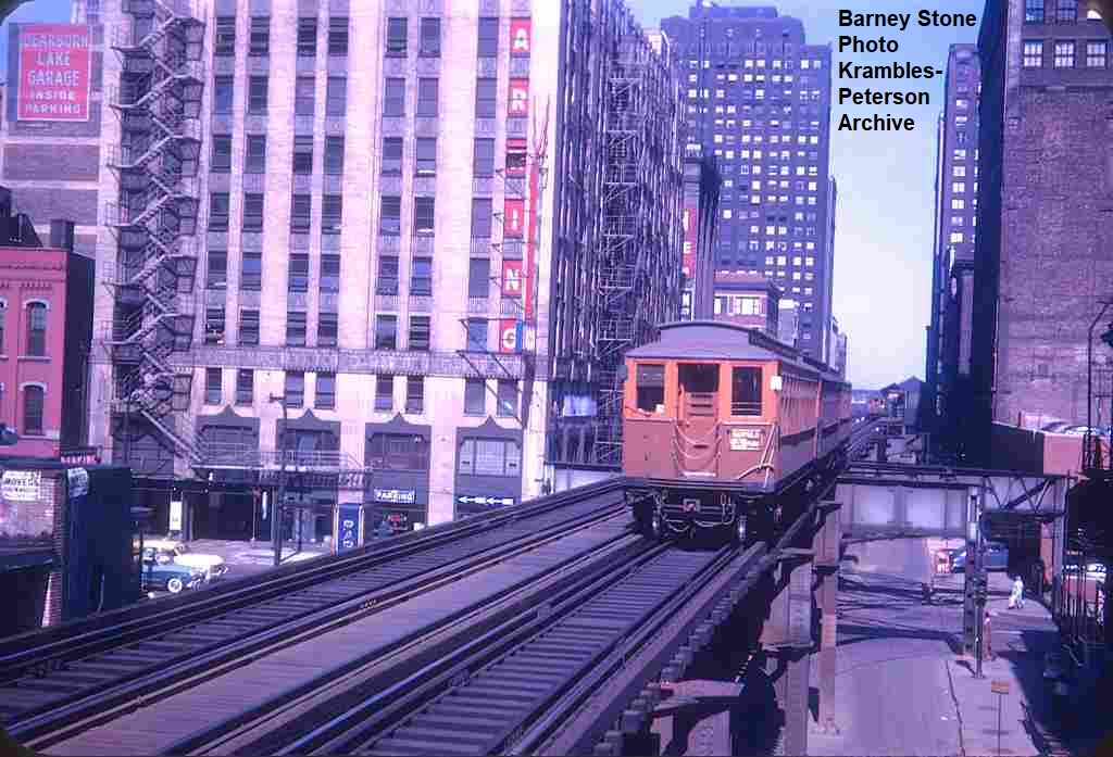 KP0842-CTA Loop, #1764 on the end of a Lake Street train near Lake & LaSalle - 06/18/1952