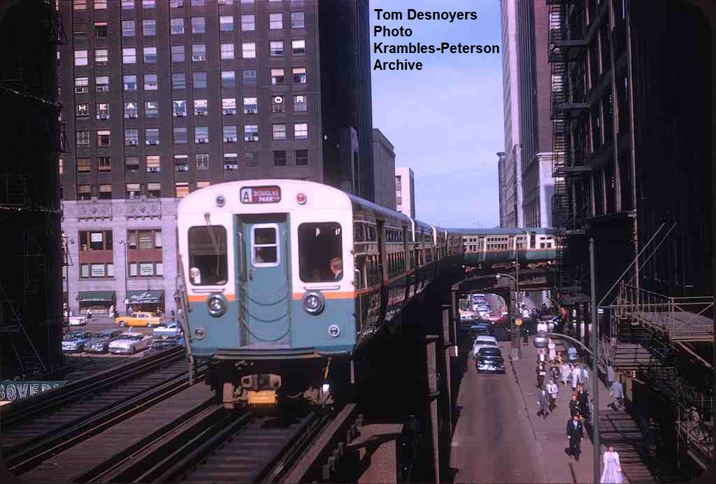 KP0856-CTA Loop, A train of flat door 6000s Douglas 'A' train westbound approaching State & Lake - 06/20/1958