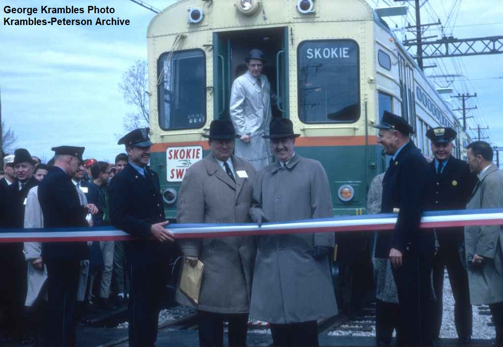 KP0977-CTA Skokie, The celebration of the one year anniversary of Skokie Swift service. The CTA Board is in front of the #53 with Chairman Demont being interviewed. Board Member JR Quinn is to the extreme right. - 04/20/1965