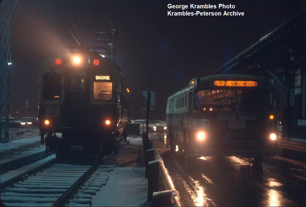 KP0979-CTA Skokie, A single #1-#50 car along side motor bus #5082 at Dempster - 02/28/1966
