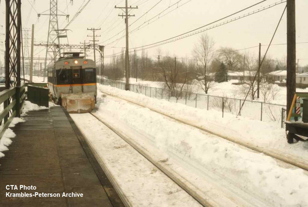 KP0988-CTA Skokie, #24 working as a snow plow coming Northbound into the Dempster Station - 01/20/1979