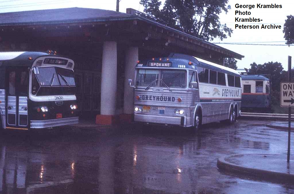 KP0995-CTA Skokie, Motor bus #3830, Greyhound bus #7668 and Rapid Transit car #52 all at the Dempster Station - 06/30/1969