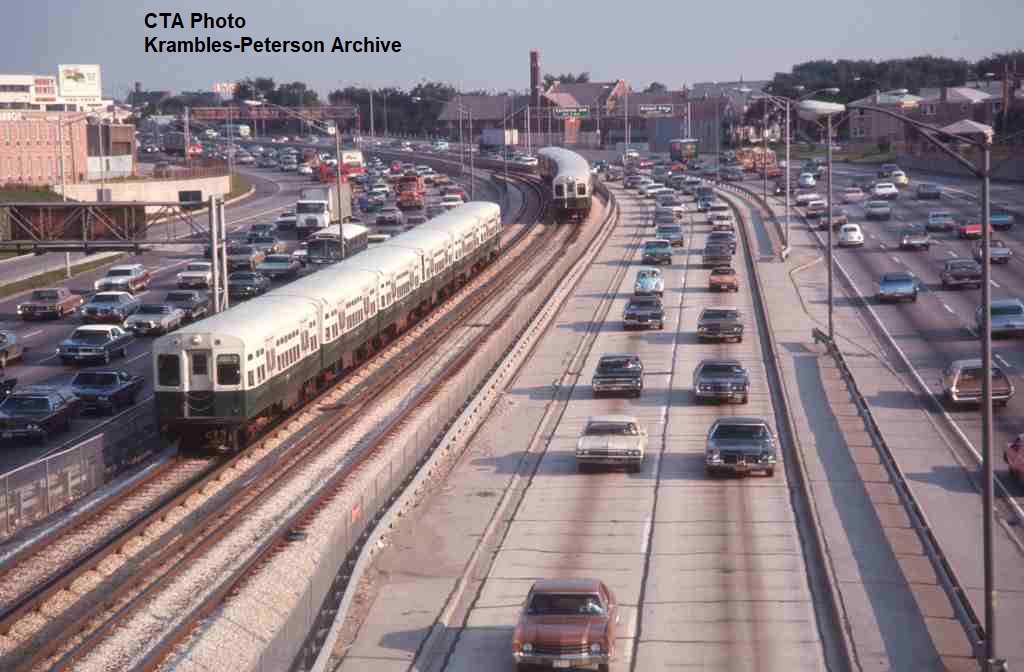 KP1089-CTA Logan Square/Milwaukee/O'Hare, Two trains of 6000s south of Addison as seen from the C&NW bridge - c09/1972