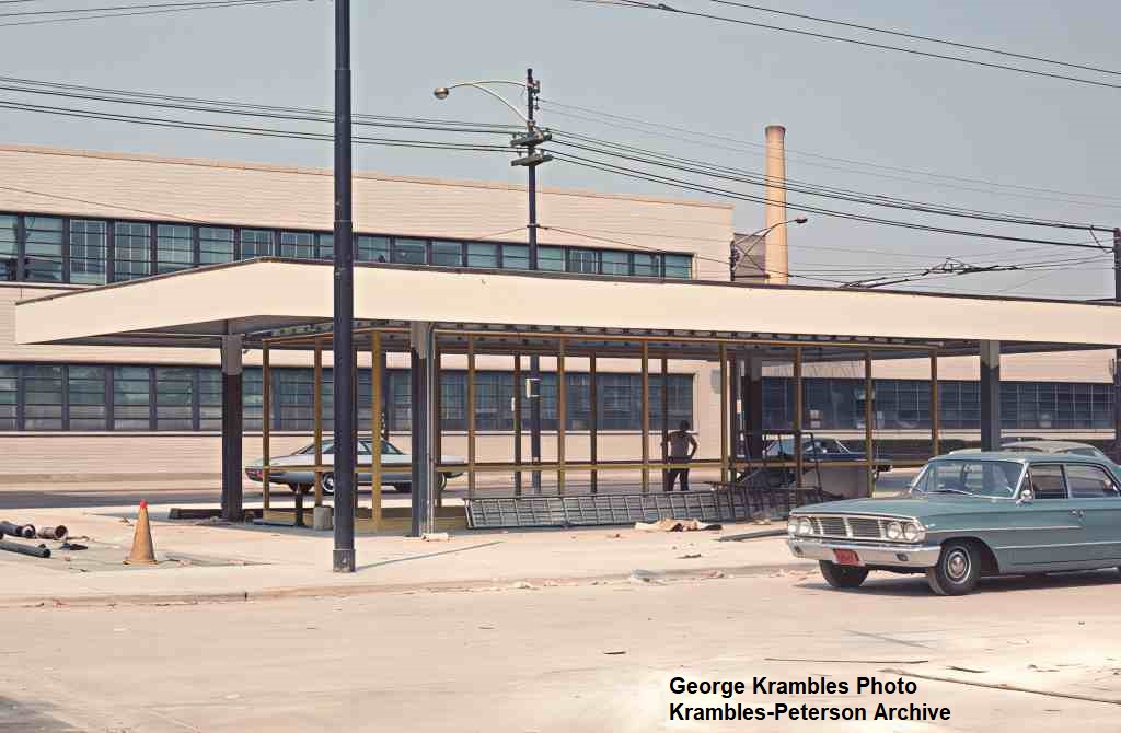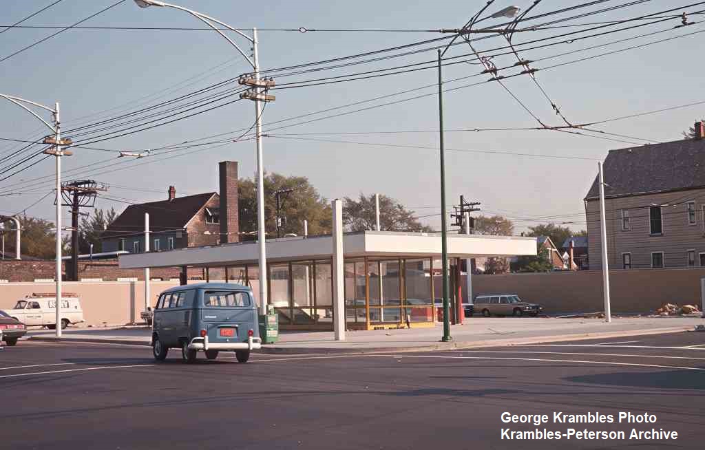 KP1093-CTA Logan Square/Milwaukee/O'Hare, View looking Southeast at the bus waiting shelter at Kimball & Belmont Station. Also in view is the last new trolley bus overhead wire ever installed by CTA. - c10/1969
