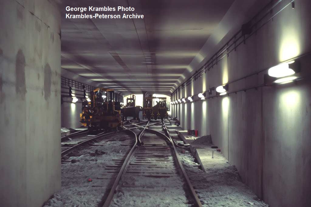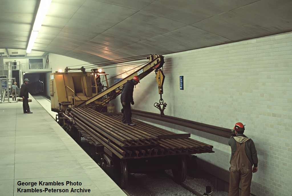KP1102-CTA Logan Square/Milwaukee/O'Hare, Contractor's "train" delivering 3rd rail in the Logan Square Station - c12/1969