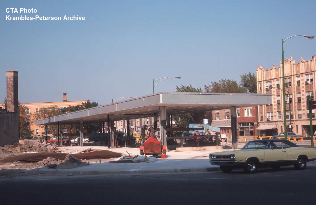 KP1092-CTA Logan Square/Milwaukee/O'Hare, View looking Northeast at the bus waiting shelter (and CTA vehicle) at Kimball & Belmont Station - 09/07/1969