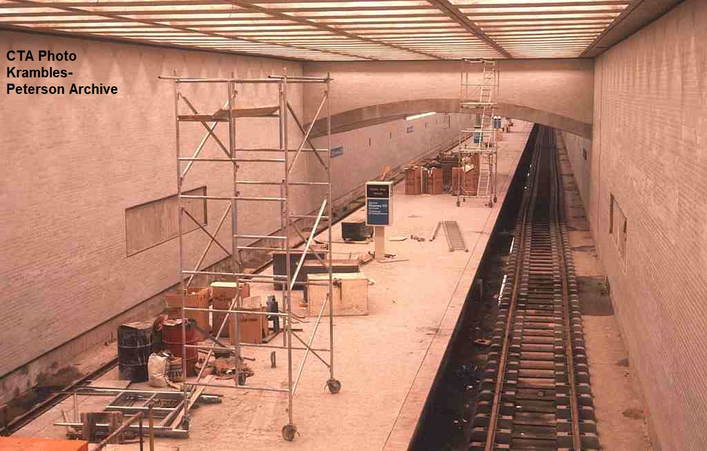 KP1100-CTA Logan Square/Milwaukee/O'Hare, Logan Square Station Platform under construction as seen from the mezzanine level - c10/1969