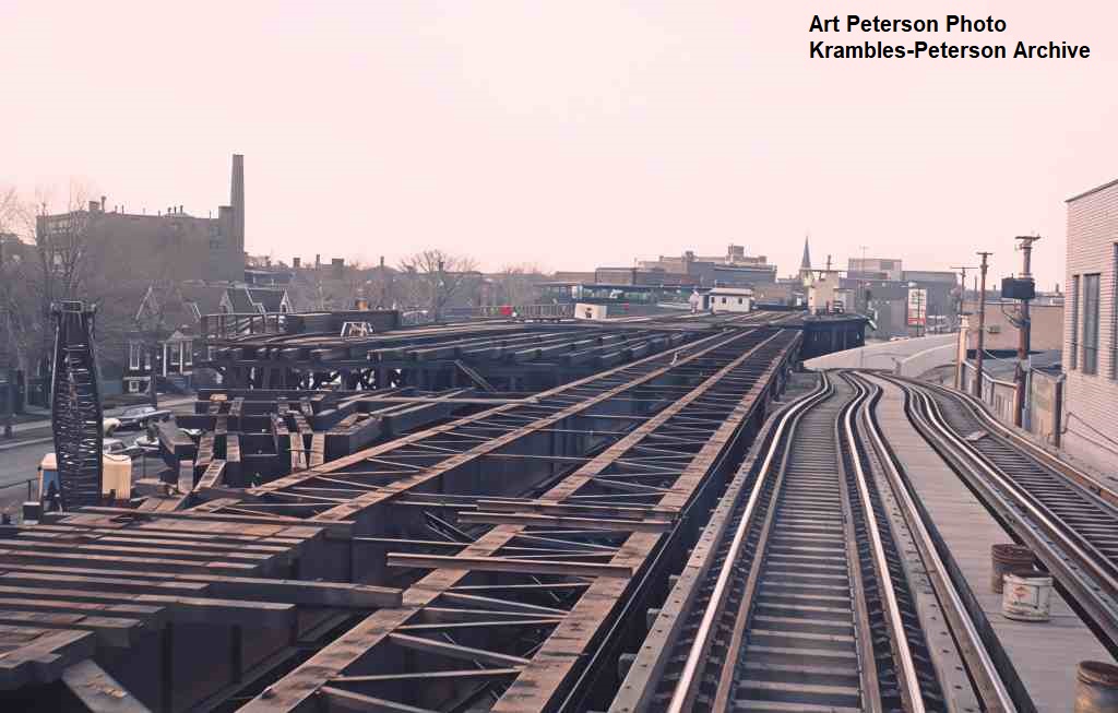 KP1117-CTA Logan Square/Milwaukee/O'Hare, Looking Northwest from Sacramento, showing the trasition to the temporary alignment existing alongside the former connections to the old yard/terminal trackage - 05/18/1970