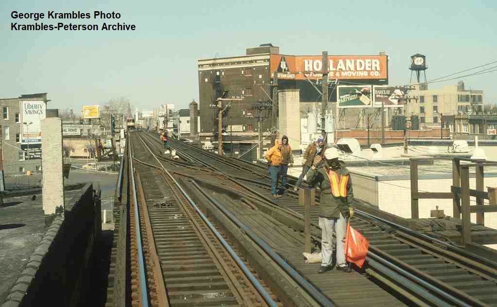 KP1119-CTA Logan Square/Milwaukee/O'Hare, Looking Northwest across the crossover that was at Fullerton during a single track operation. Note the 2400 train in the distance waiting for the Northbound to clear. - 03/15/1981