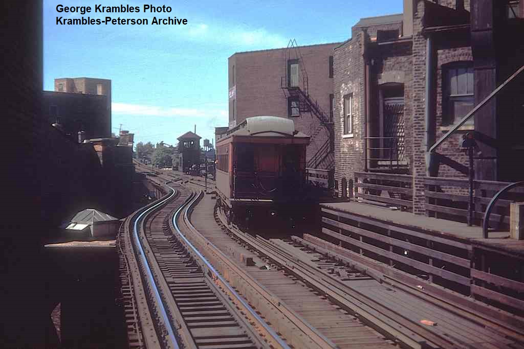 KP1125-CTA Logan Square/Milwaukee/O'Hare, Looking Northwest from the Damen Station at a single Humboldt Park car preparing to diverge onto the branch - 08/1950