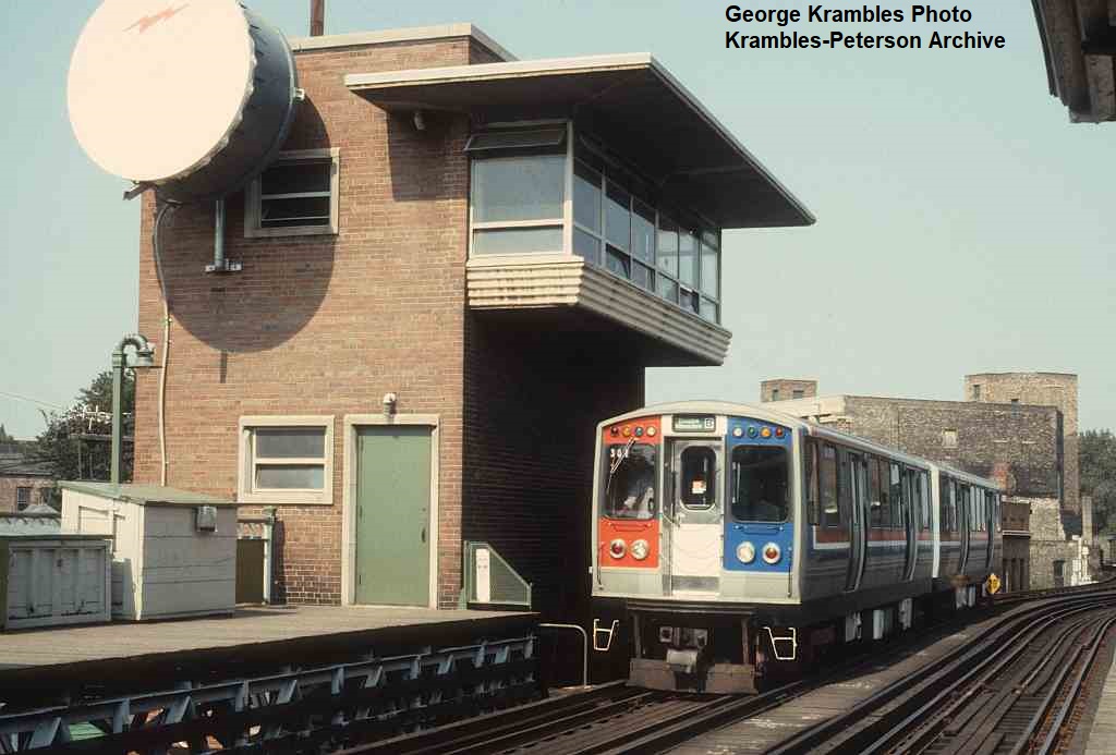 KP1127-CTA Logan Square/Milwaukee/O'Hare, 2400s passing the Damen tower with microwave relay dish installed - 09/12/1981