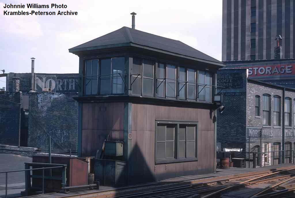 KP1137-CTA Logan Square/Milwaukee/O'Hare, View looking East past the tower at Lawndale Terminal on the Humboldt Park Branch. Note the run number tags, first aid station sign, plus outline of switchman's chair and lamp visible inside the tower. - 08/13/1950