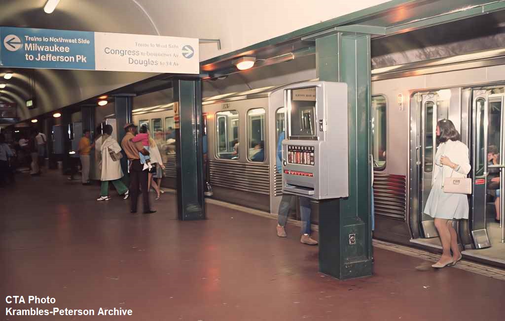 KP1147-CTA Logan Square/Milwaukee/O'Hare, Jackson platform featuring column-mounted vending machine - 07/1971