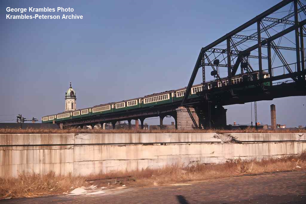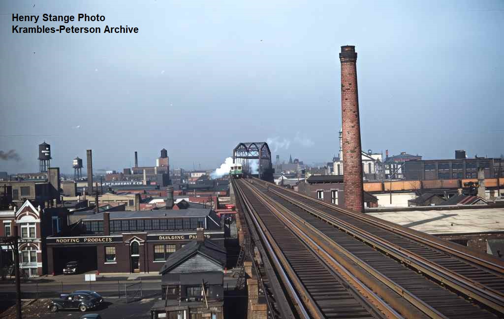 KP1156-CTA Logan Square/Milwaukee/O'Hare, A train of 4000s being transferred to Milwaukee Ave Subway service as seen from south of the bridge near Carroll St - 10/11/1952