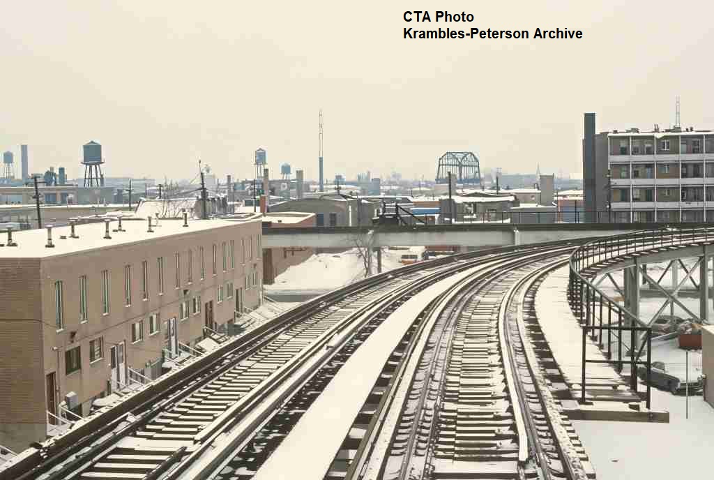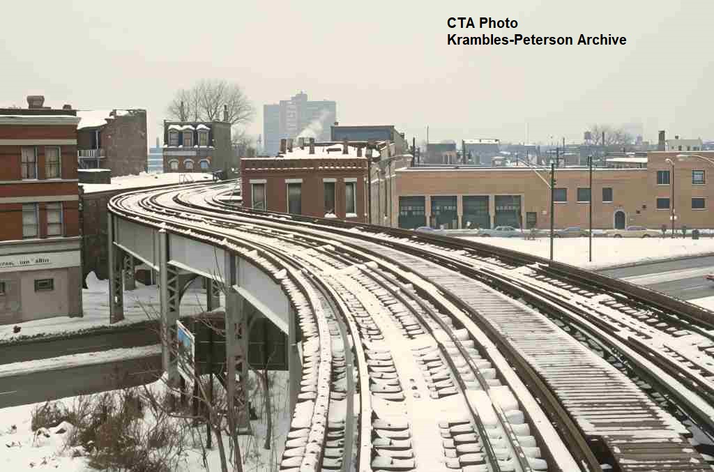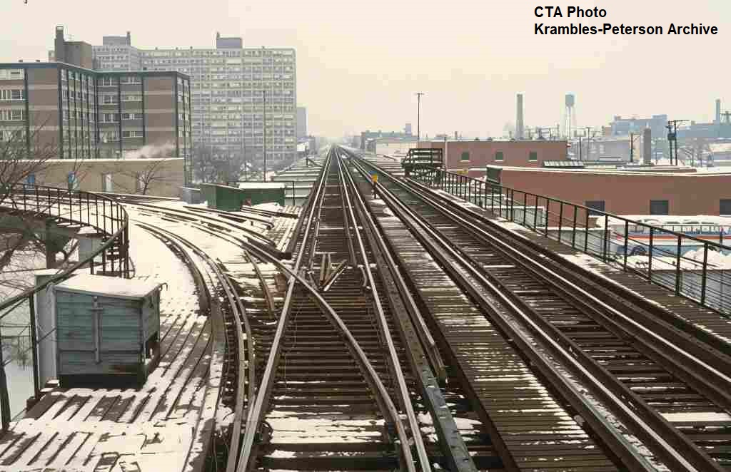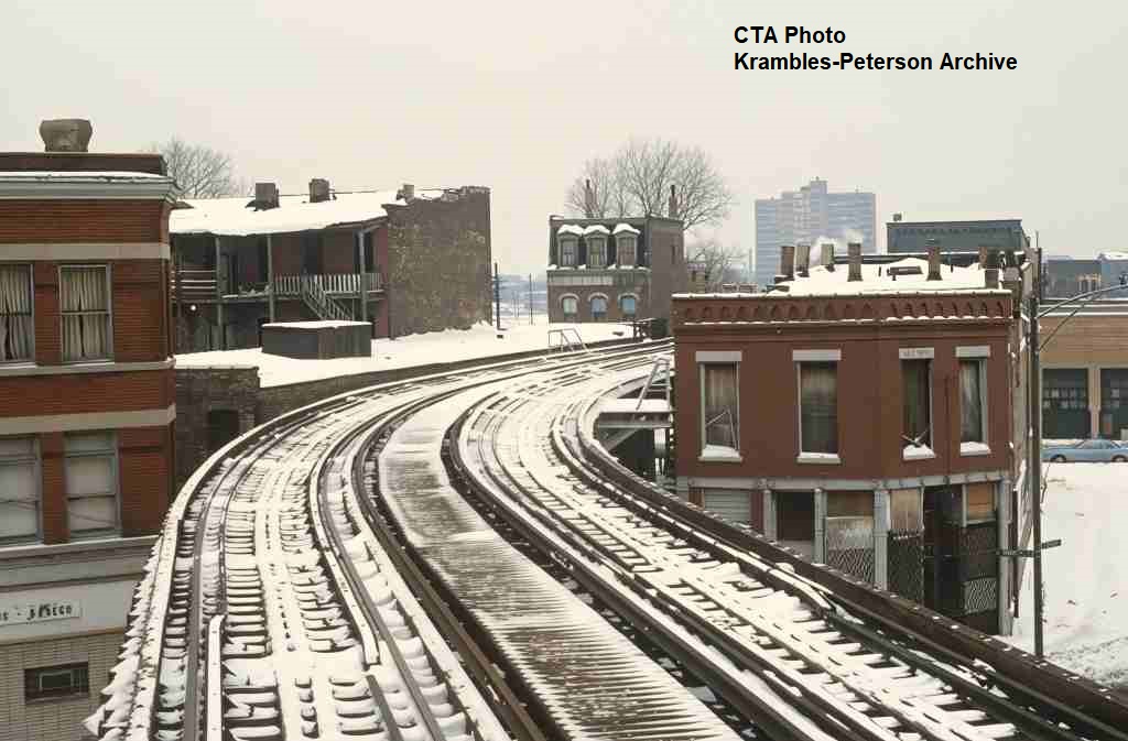 KP1166-CTA Logan Square/Milwaukee/O'Hare, Just south of Ogden showing the jog in the track - 01/12/1979