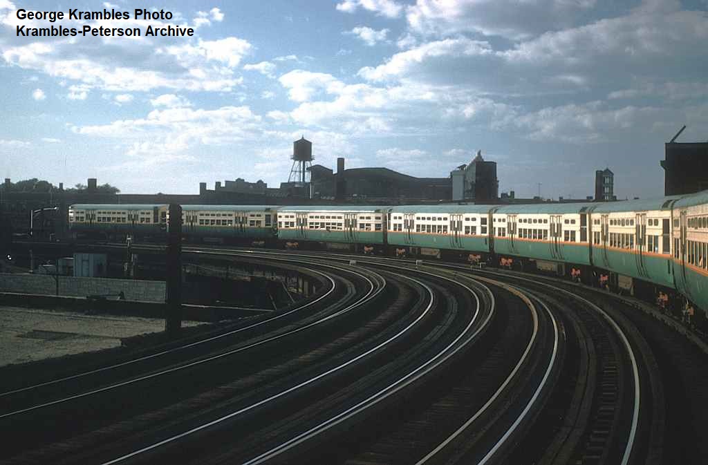 KP1266-CTA Howard/Dan Ryan, View looking South from the Belmont Station pedestrian bridge with a 2-car high speed train visible - 01/12/1963