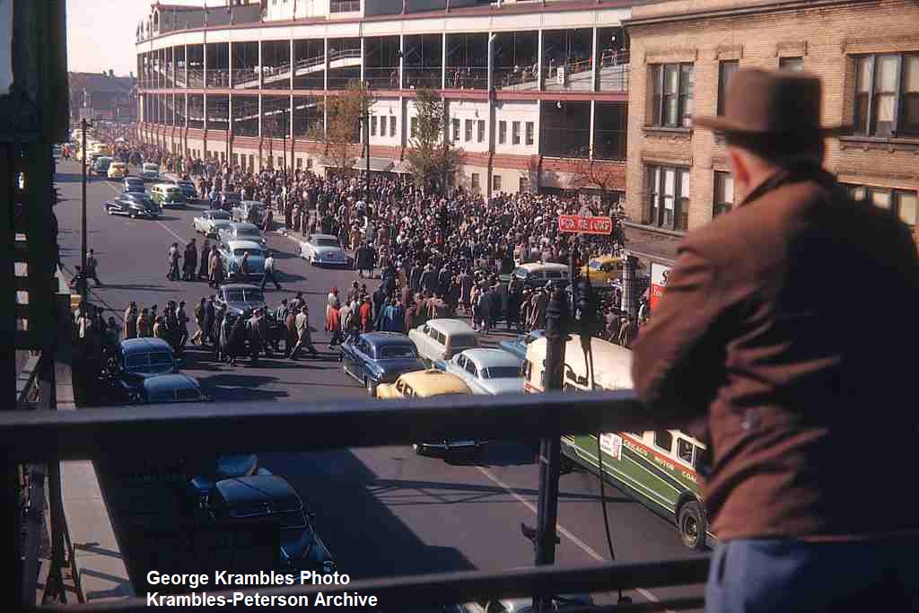 KP1246-CTA Howard/Dan Ryan, View from the Addison Station Southbound platform, looking over photo contributor Henry Stange's shoulder at the crowd heading to a Bears-49ers game at Wrigley Field. The crown would leave disappointed as the 49ers beat the Bears 40-16. Part of a 500-series Chicago Motor Coach bus is also visible. - 10/19/1952