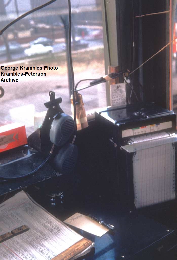 KP1273-CTA North Side Mainline, Details in the interior of the Supervisor Booth at Fullerton which includes: Esterline-Angus pen recorder graph to the right of the view. This would show both scheduled service as well as recording how it was actually operating, so the supervisor could take action. The PA mike is in the center of the view, where he could talk to both crews and passengers. The schedule sheets are to the right on the desk. The red box in the view held the paper for the event recorder. - 10/28/1951