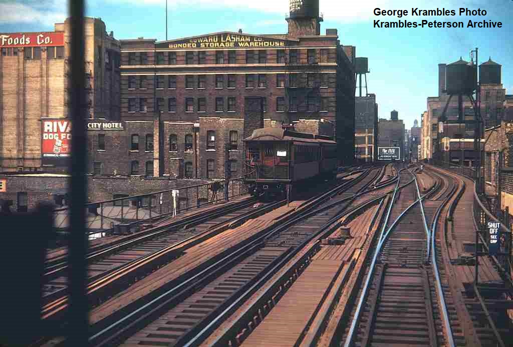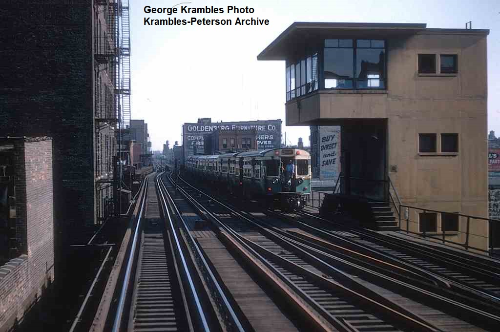 KP1281-CTA North Side Mainline, Looking out of the tower at a Southbound train passing Armitage - 07/21/1951