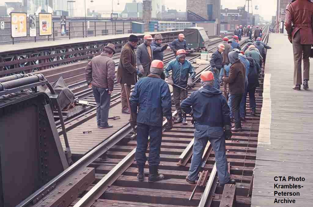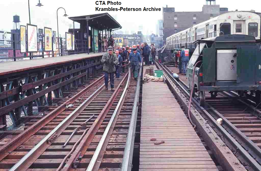 KP1304-CTA South Side Mainline, Looking north at the track renewal work on the southbound tracks through the Cermak Station - 01/1972