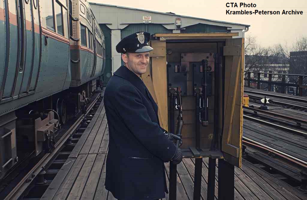KP1377-CTA Jackson Park Branch, Supervisor operating one of the power disconnect switches in 61st Street Yard - c11/1967