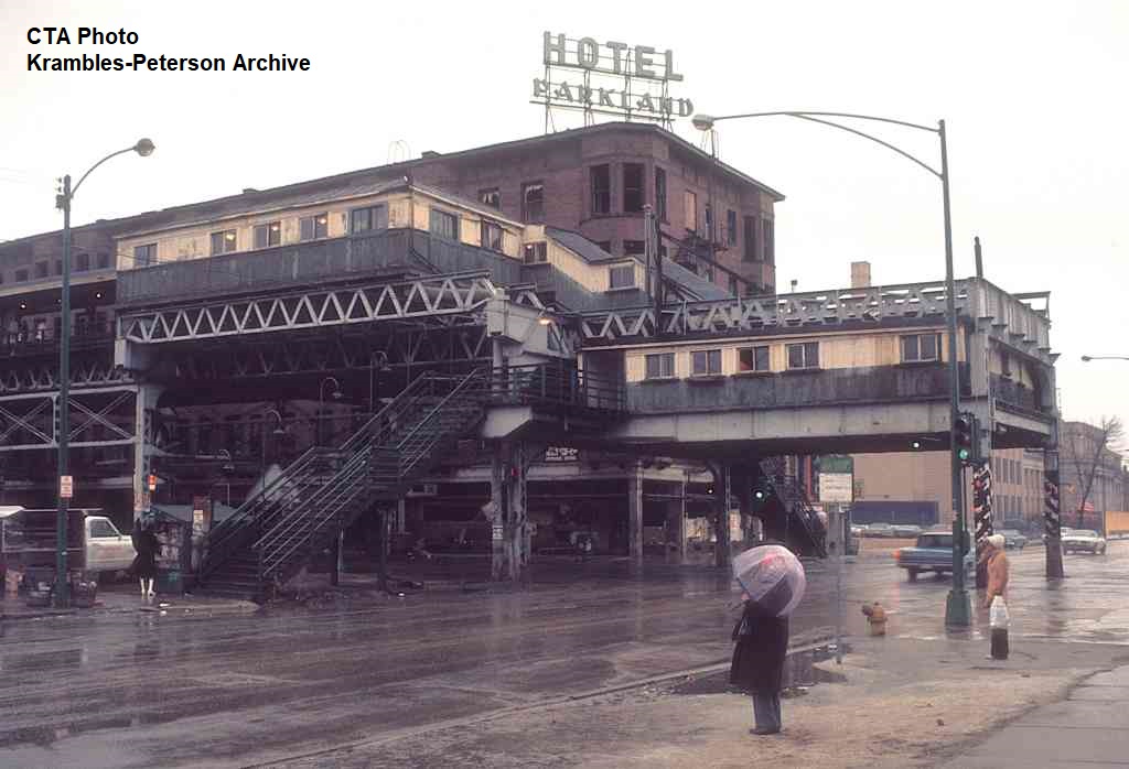 KP1389-CTA Jackson Park Branch, Looking Northwest at the Terminal Station House at 63rd & Stony Island - c03/1973