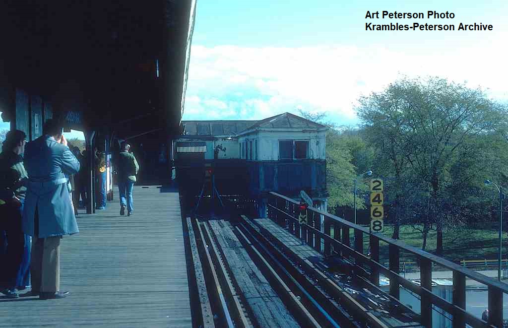 KP1390-CTA Jackson Park Branch, Looking east along the platform edge toward the station house at 63rd & Stony Island during a CERA Fantrip using 2400s - 10/31/1976