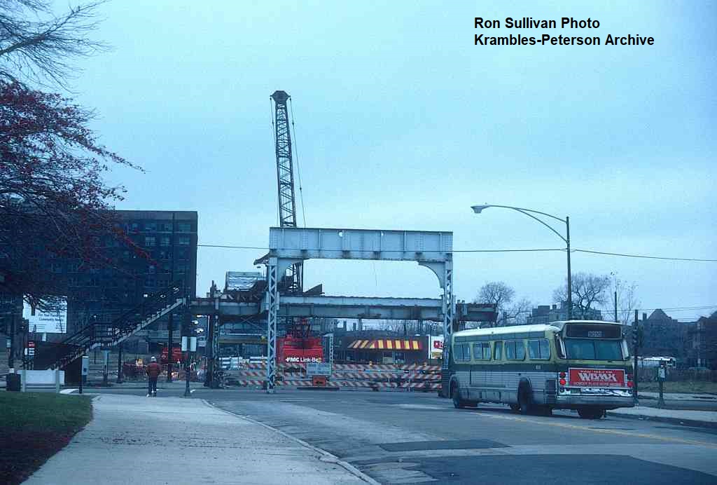 KP1391-CTA Jackson Park Branch, Bus #9010 with a head-on view of the demolition work occurring near Stony Island & 63rd - 10/27/1986
