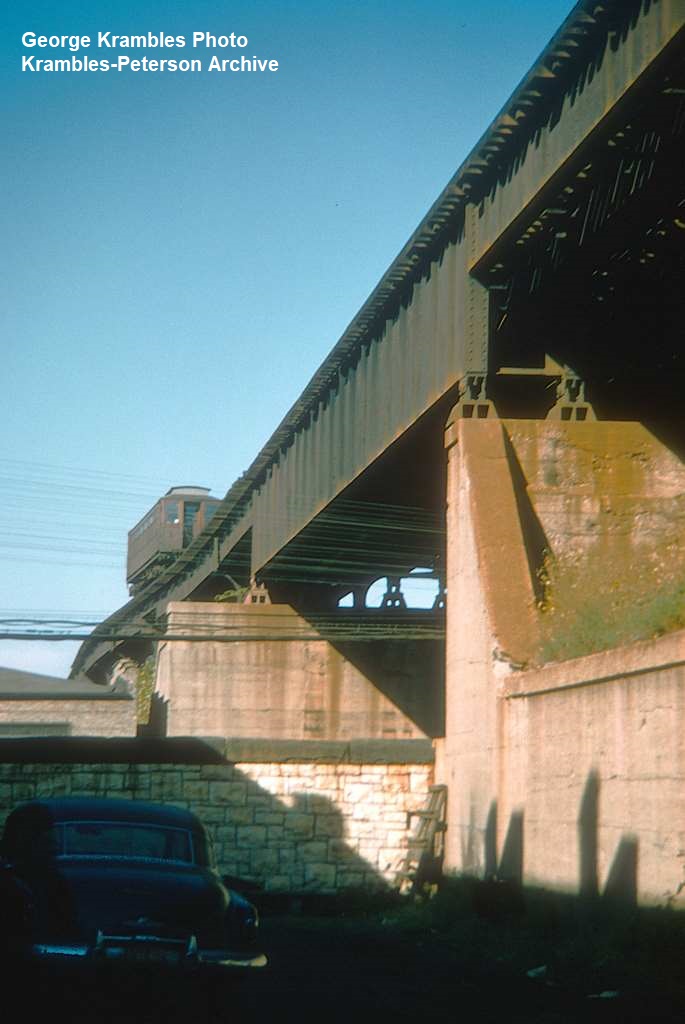 KP1394-CTA Stock Yards Branch, Looking up at the structure over the RI-NYC tracks near Federal Street - 10/05/1957