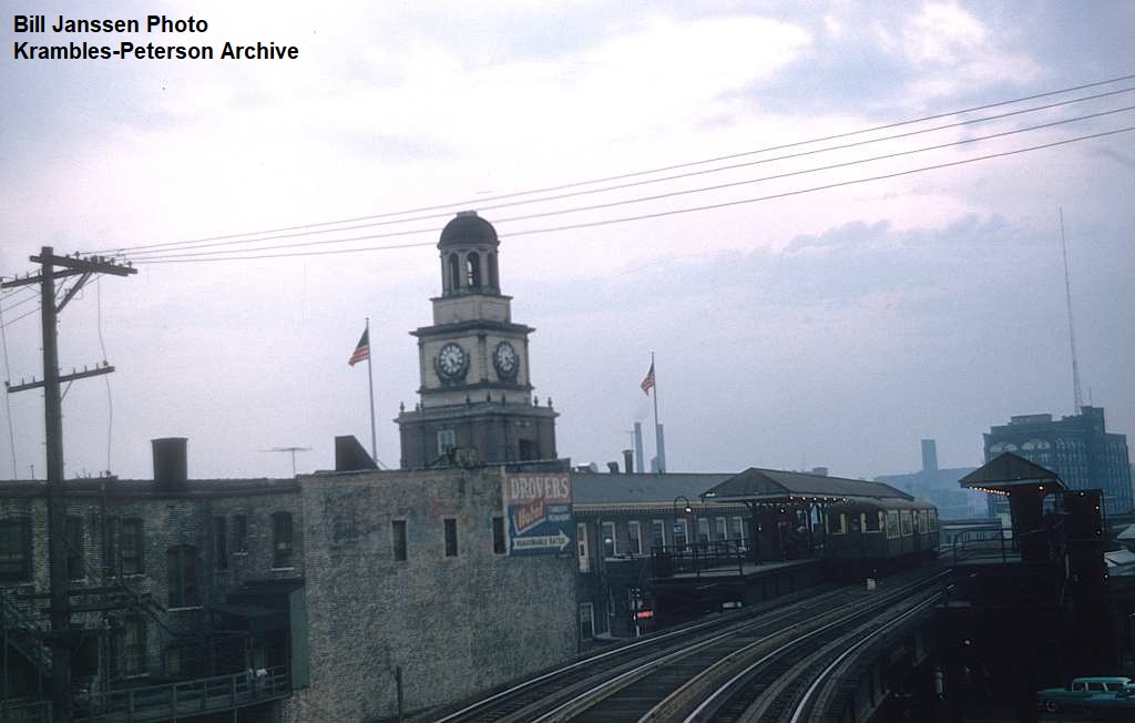 KP1397-CTA Stock Yards Branch, Halsted Station with a train of 4000s which were temporarily assigned to the Stock Yards Branch during the Democratic Convention - 08/1956