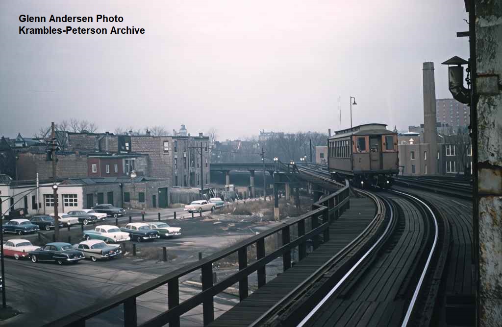 KP1409-CTA Kenwood Branch, Looking down on a car sitting in the pocket at the 40th & Indiana Station on the last day of operation - 11/30/1957