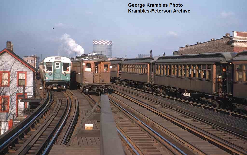 KP1496-CTA Ravenswood, Two Ravenswood trains about to pass each other west of the Sedgwick Station - 03/1953