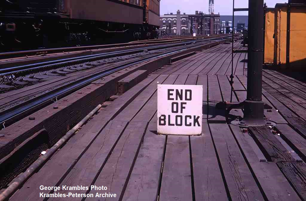 KP1506-CTA Ravenswood, "END OF BLOCK" sign near Chicago with a Southbound train coming off the outer track in view to the left - 07/14/1950