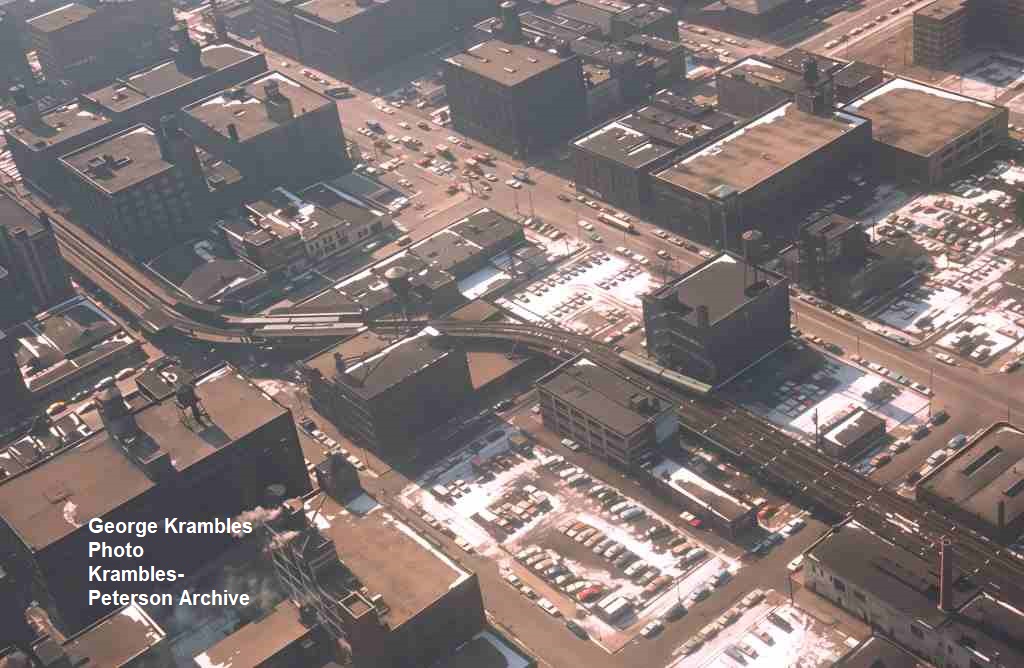 KP1508-CTA Ravenswood, Arial view of the Chicago-Franklin area with three trains in view, one coming off the southbound outer track - 02/21/1966