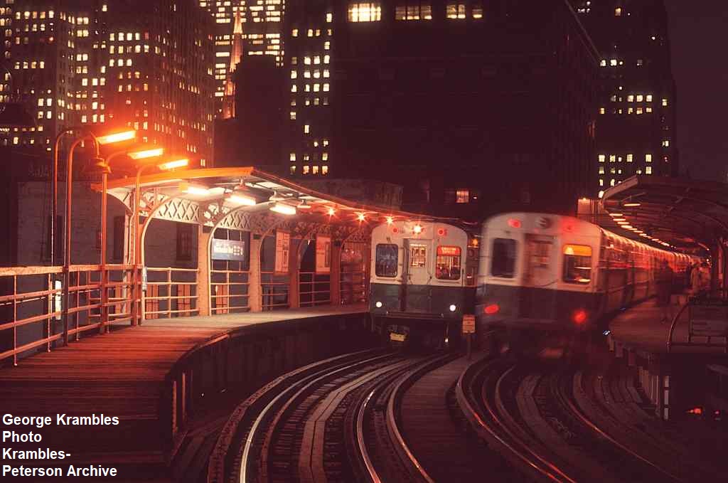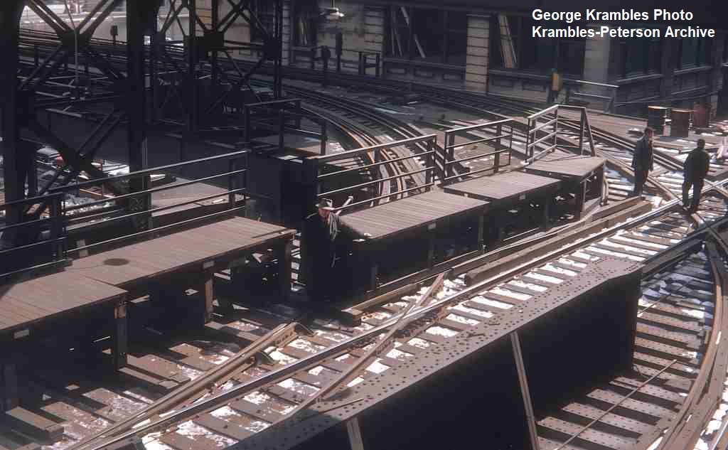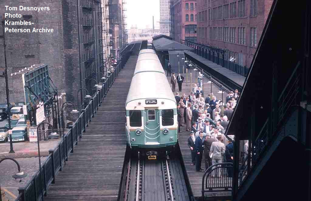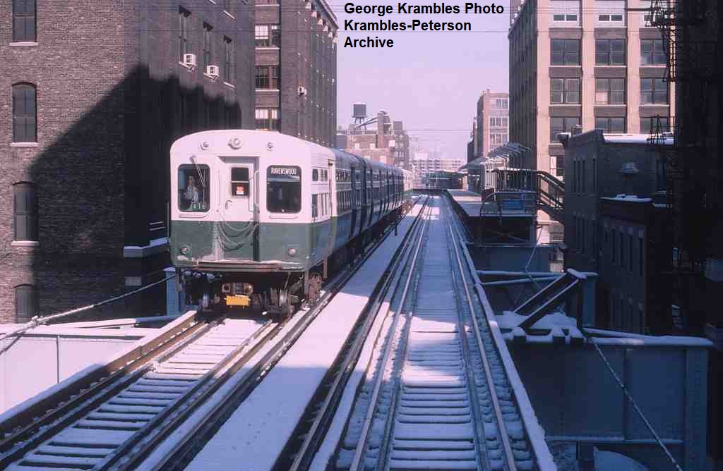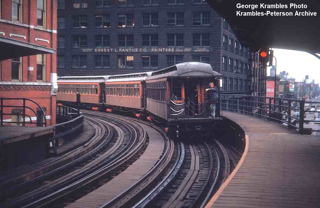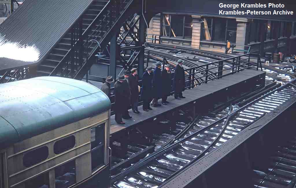 KP1524-CTA Ravenswood, To eliminate the need to stop on the curve, and at the same time provide for periodic access to/from the North Water Terminal tracks, CTA built a moveable platform in sections that could be deployed to extend the tangent platform length to the south of the Merchandise Mart Station - 02/1952