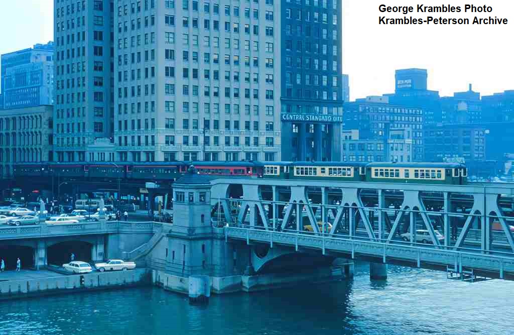 KP1538-CTA Ravenswood, Northbound North Shore train meeting a Ravenswood train on the Wells Street Bridge - 05/16/1962