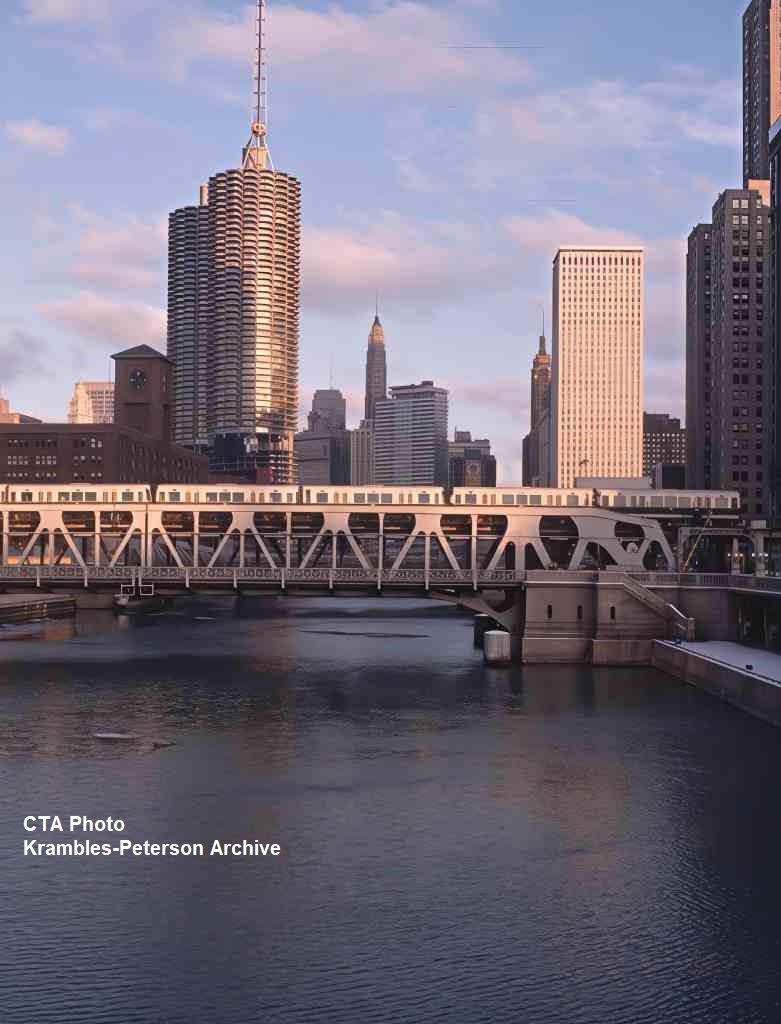 KP1539-CTA Ravenswood, Posed shot of 2000s, headed by car #2100, around sunset on the Wells Street Bridge - 12/27/1964