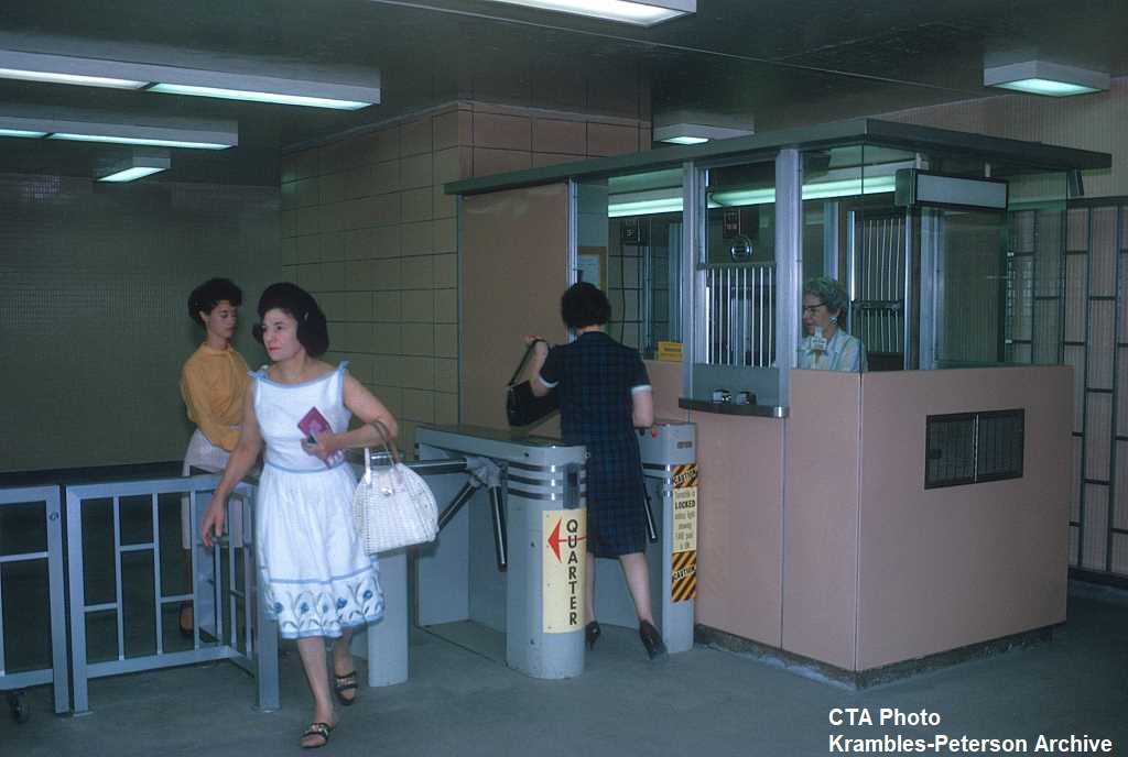 KP1663-CTA Lake-Dan Ryan, Oak Park Station Agent's Booth and fare collection area - 08/23/1963