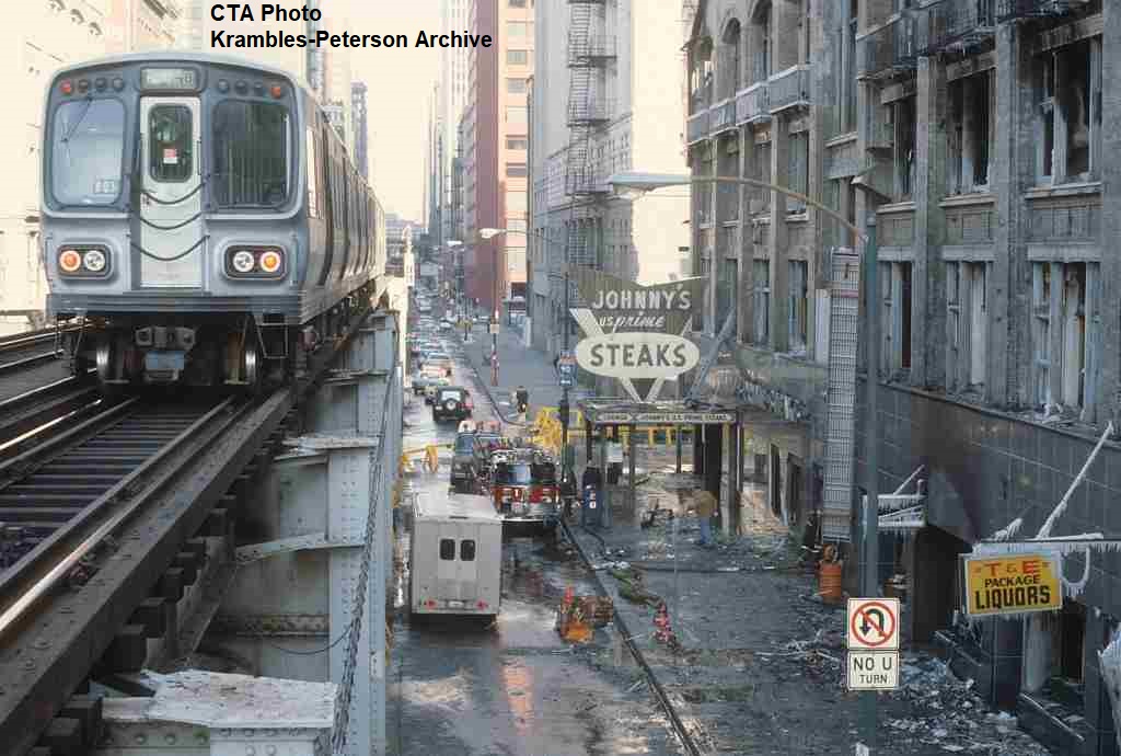 KP1707-CTA Lake-Dan Ryan, a pair of 2000s on the end of a train holding at Wabash & Congress due to a building fire - 11/18/1978