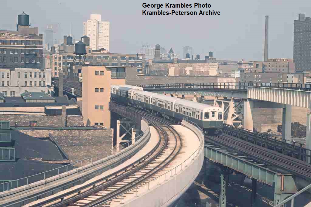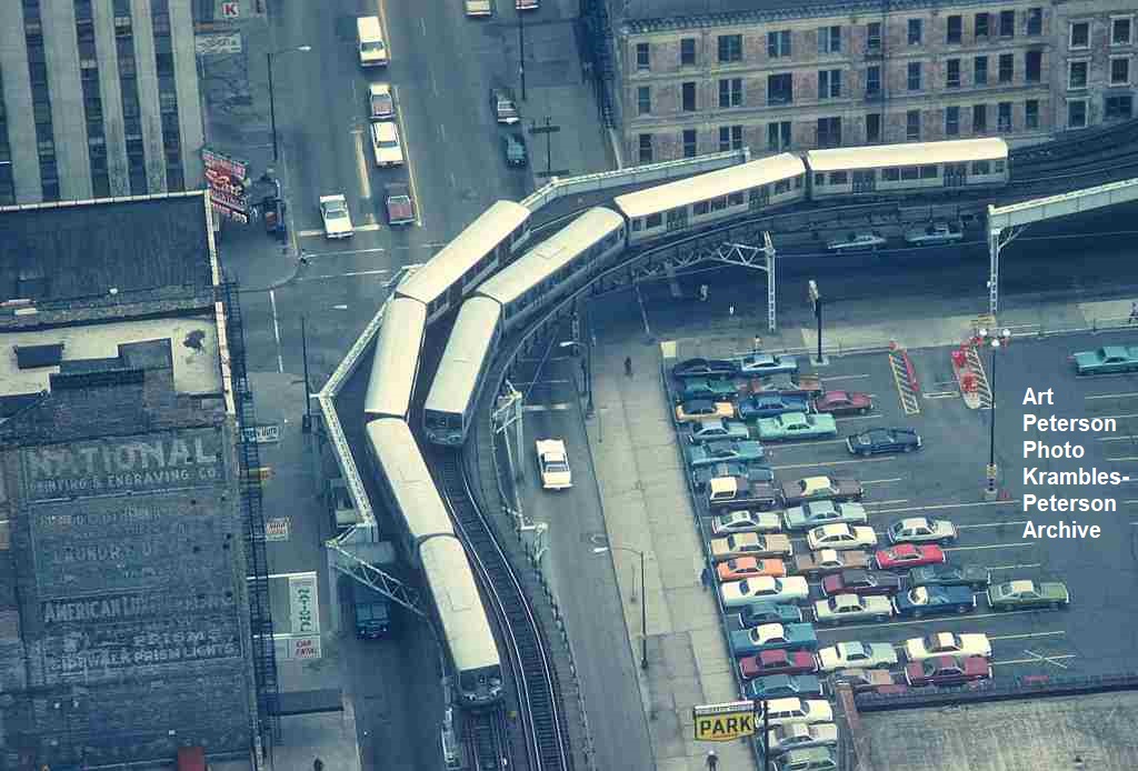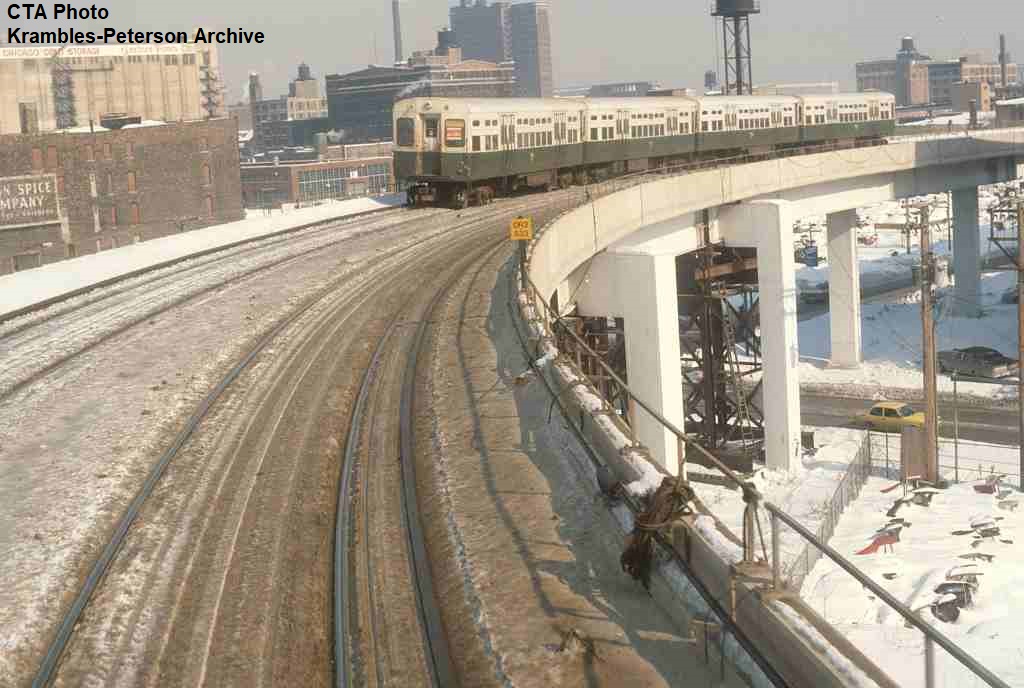 KP1732-CTA Lake-Dan Ryan, A train of 2000s rounds the curve at 18th Street as seen from the Cermak Station - 10/1969