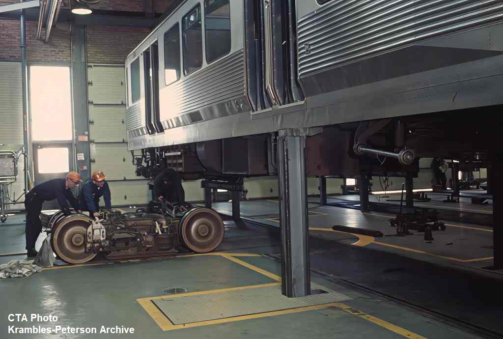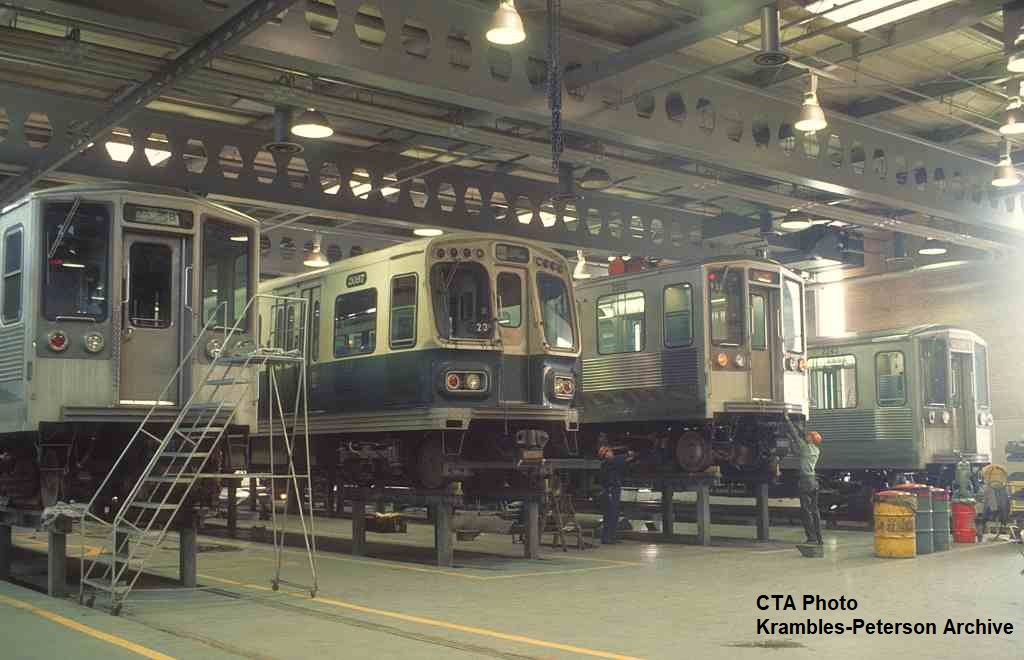 KP1701-CTA Lake-Dan Ryan, 2200s going through truck change-out inside Forest Park Shop - c03/1970